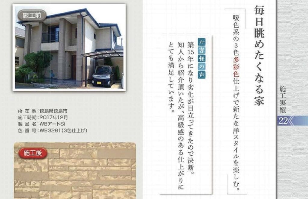 外壁サイディング工事・外壁塗装工事を中心に、これまでに手がけた施工事例をご紹介しています。WBアートを使用した多彩仕上の事例も掲載しています。